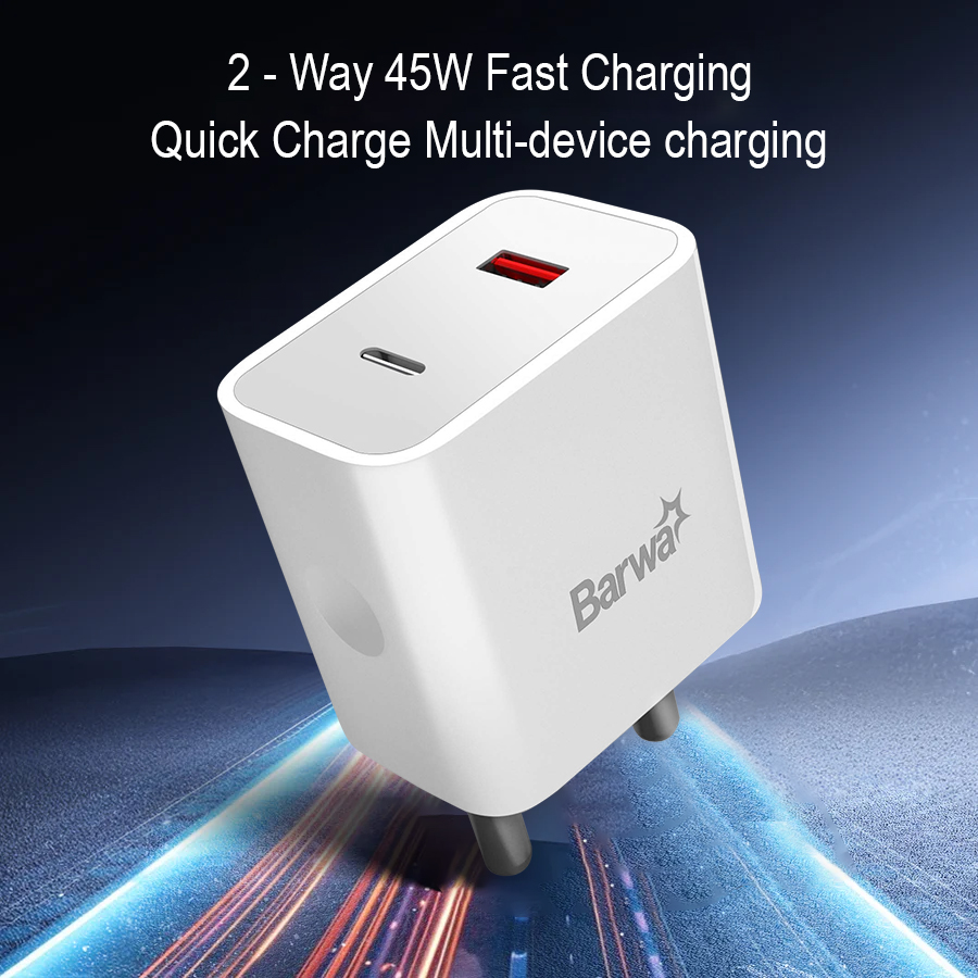 Power up faster with the Barwa BHC-1015 45W PD + QC Fast Charger. Designed for universal compatibility, it features USB-C Power Delivery and QC 3.0 ports for efficient multi-device charging. Built with high-temperature resistant materials and multiple protection layers for safe, reliable performance.